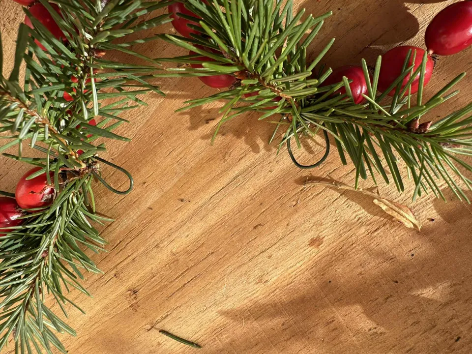 Spoj věnečku ozdobte malou větvičkou z jehličnanu, smrku nebo jedle, připevněte je drátkem. Z konců drátku vytvarujte očko na zavěšení