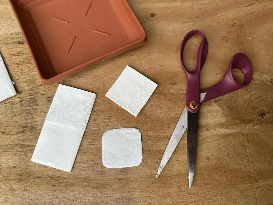 Z obyčejného papírového kapesníčku nebo papírové utěrky vystřihněte čtverec se zaoblenými rohy nebo jiný tvar, který na sklenici ohraničí okénko pro svíčku. Velikost tedy zvolte podle vybrané sklenice