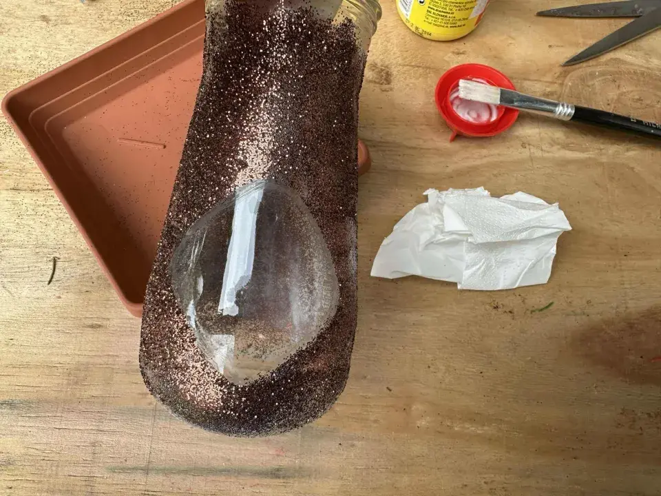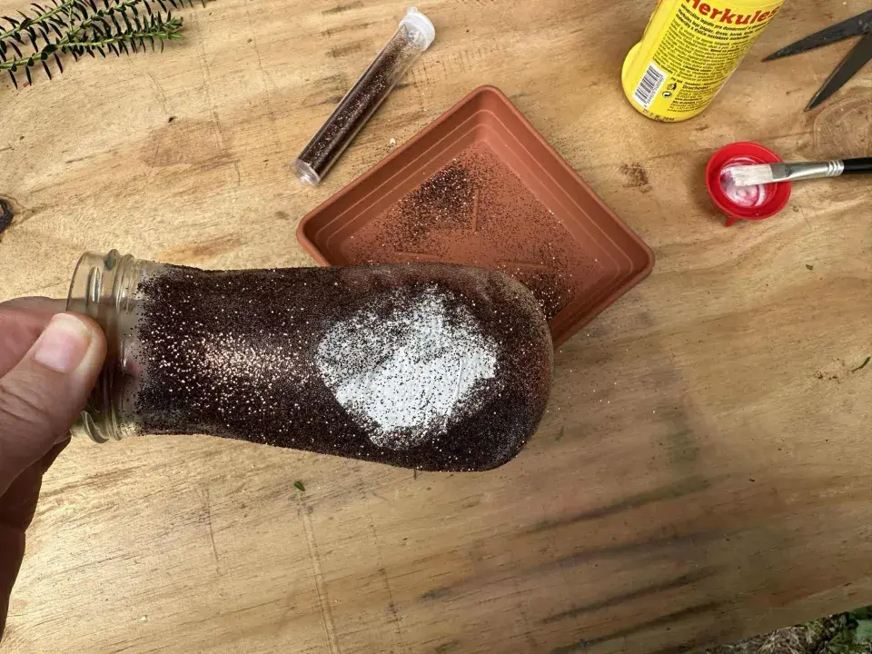 Ihned po natření lepidlem rovnoměrně posypte sklenici jemnými třpytkami