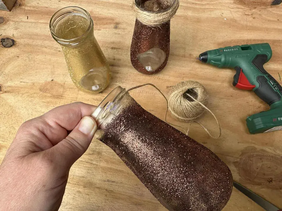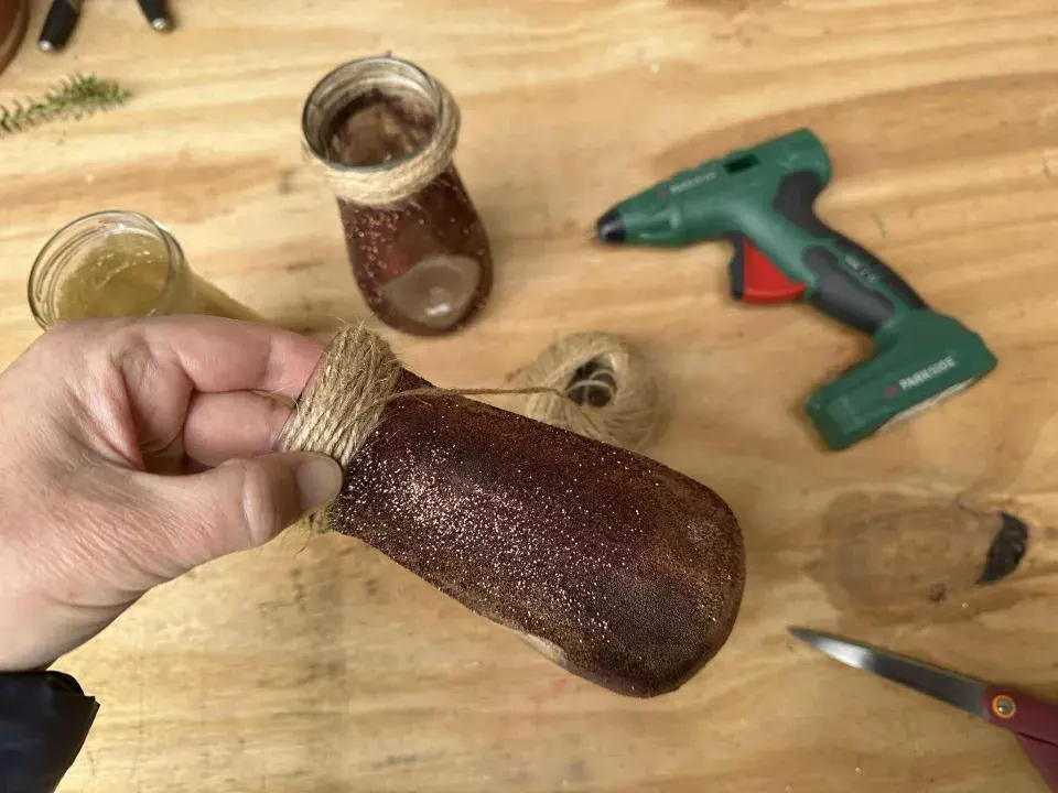 Po zaschnutí lepidla kolem hrdla sklenice omotejte provázek, který zakryje nevzhledné šroubování pro víčko