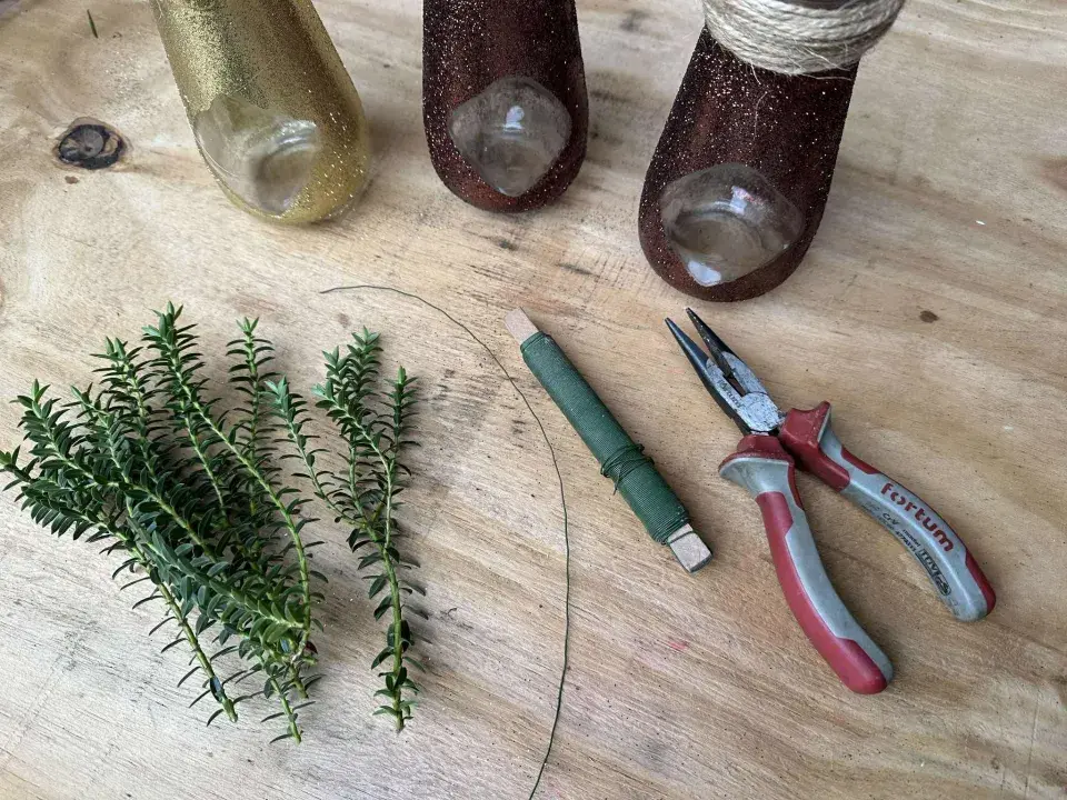 Věneček připevněte kolem hrdla sklenice, pod provázek. Vznikne tak harmonické propojení přírodních a třpytivých prvků