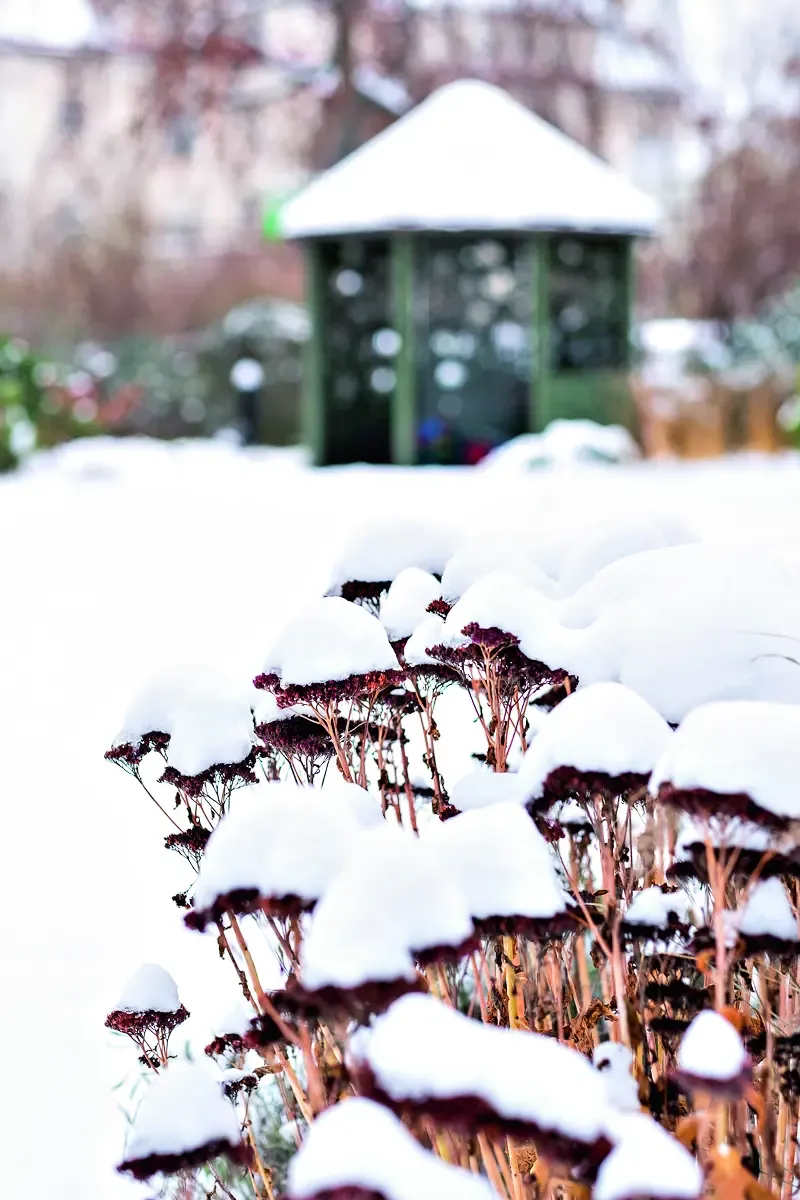 Pohled nakonec zabloudí k altánu, schovanému mezi dřevinami. Jen se někdy dívá me přes zasněžené rozchodníky a jindy přes trávník