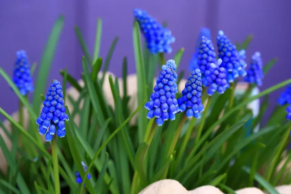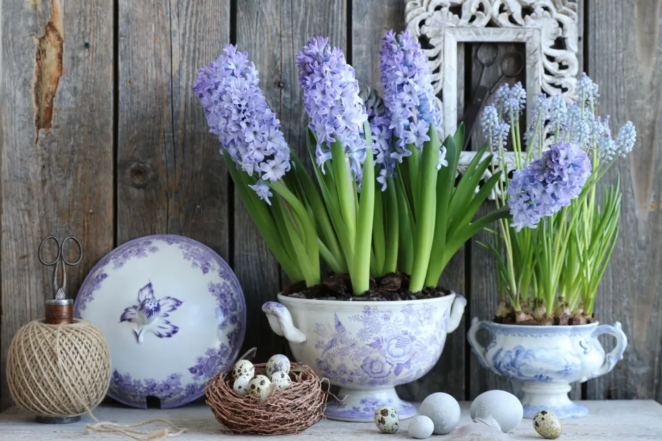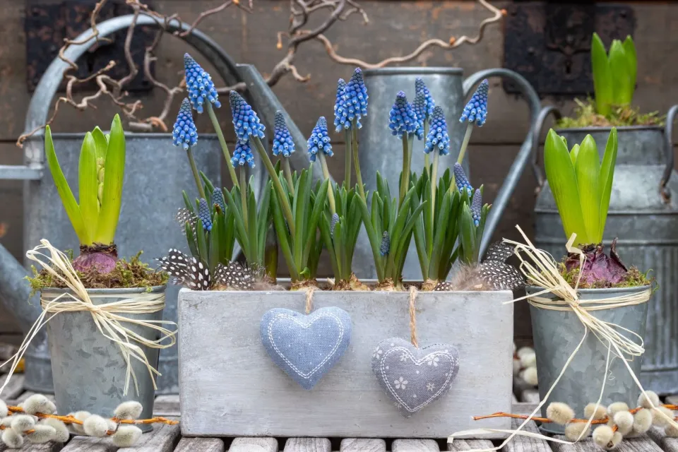 Jarní výzdoba balkonu vypadá úchvatně, když je osázená hyacinty a modřencem
