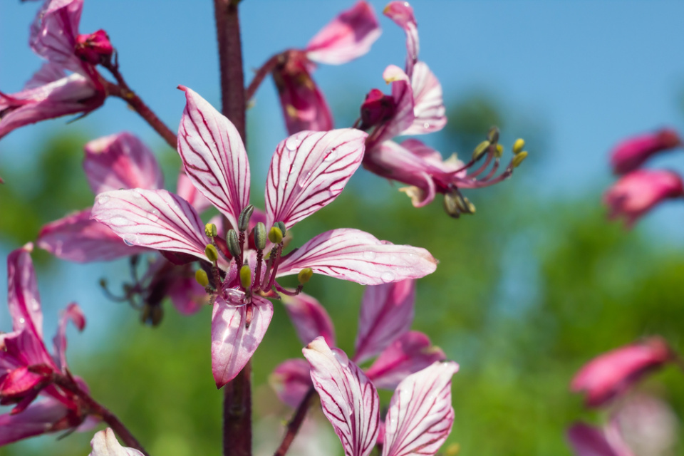 Nádherné květy mají okvětní lístky s výrazným, tmavě nachovým žilkováním