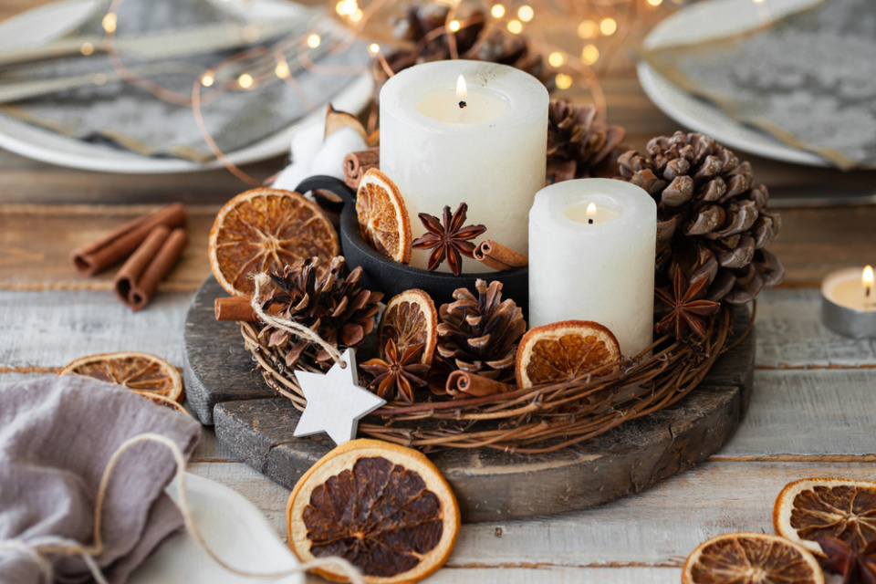 Využijte sušené citrusové plátky i k ozdobení svícnu.