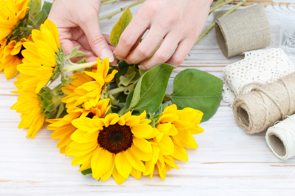Slunečnice vyrovnejte k sobě tak, že kolem jedné středové slunečnice vyskládáte všechny ostatní tak, aby při pohledu ze strany tvořily vyklenutý oblouk