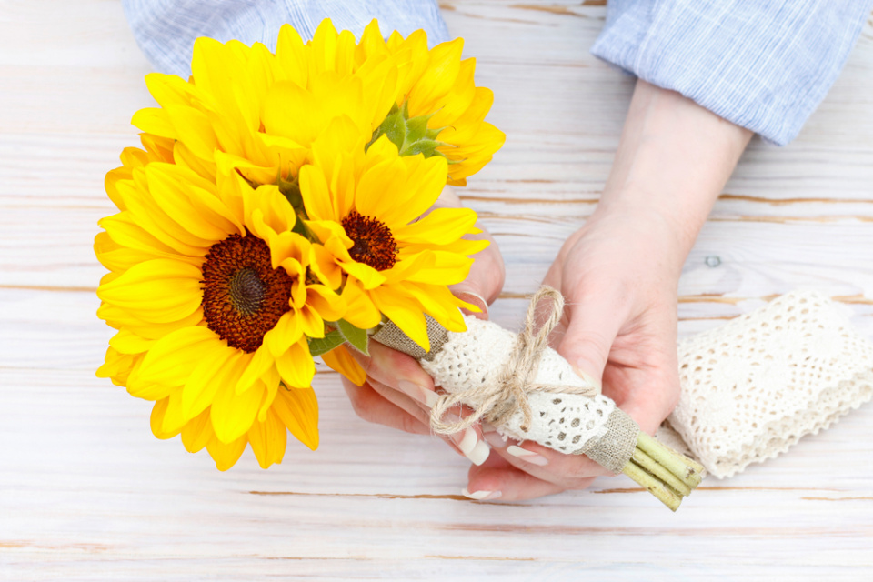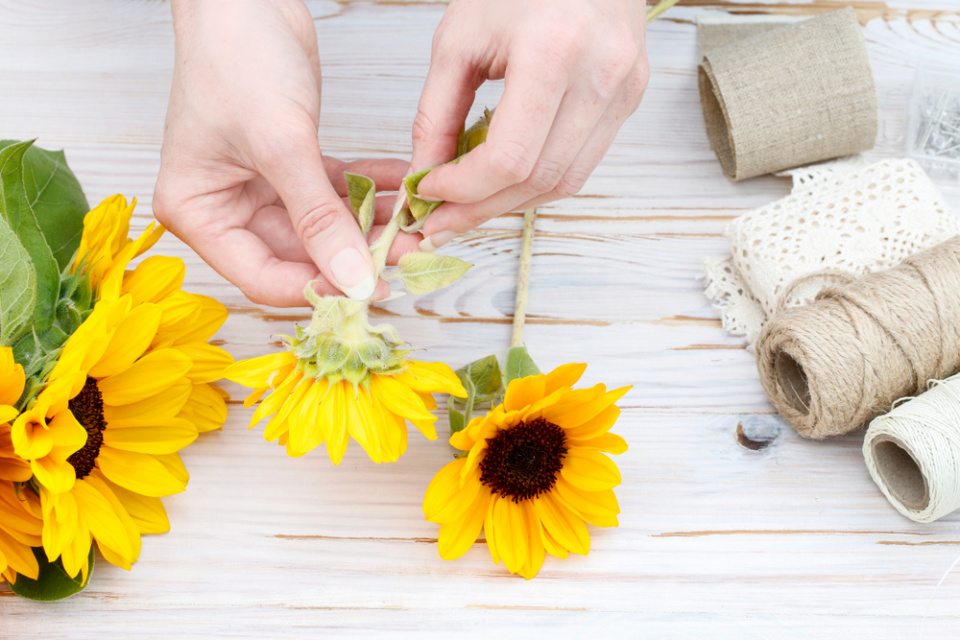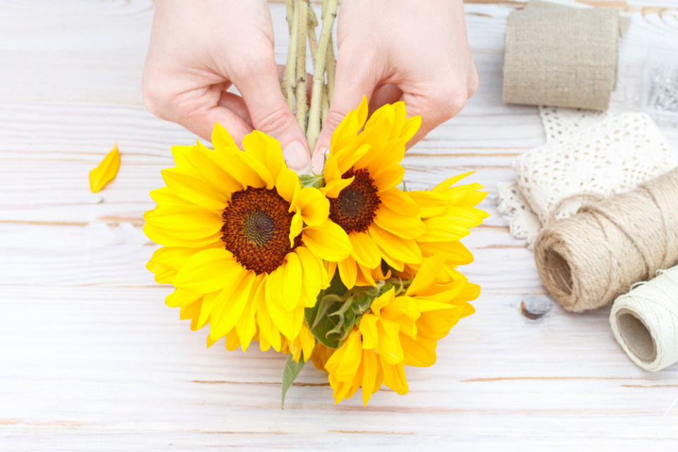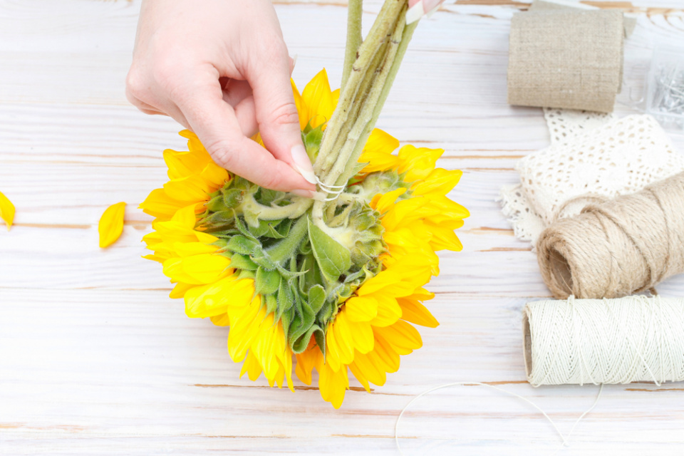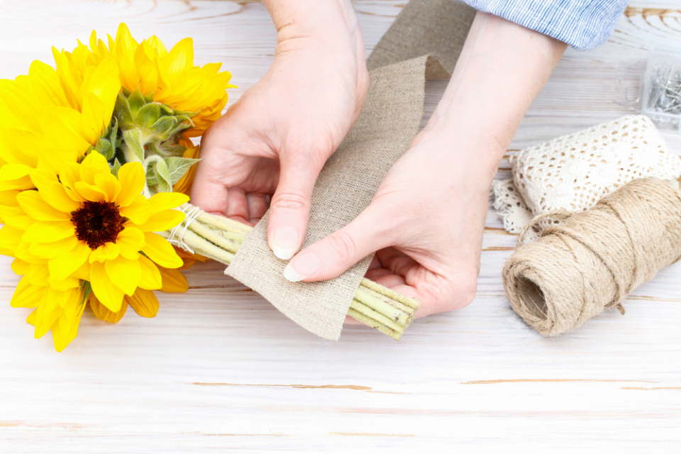 Stonky svázaných slunečnic obalte širokou stuhou z juty. Můžete použít i starší, ale čistý, jutový pytel, ze kterého ustřihnete pruh materiálu