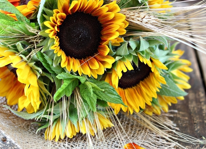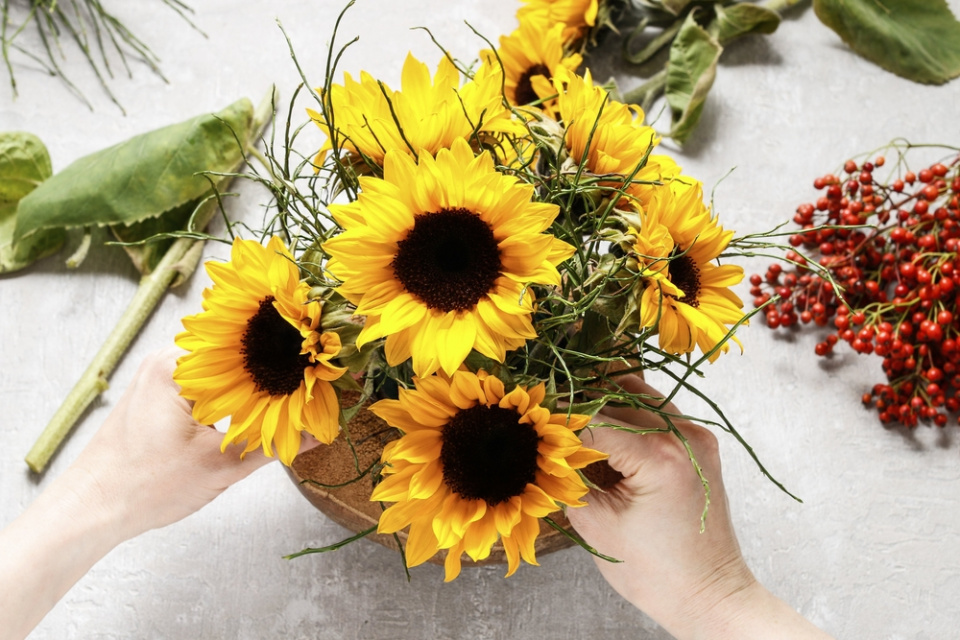 Jako doplněk ke slunečnicím se hodí i větvičky borůvek, zbavené listů