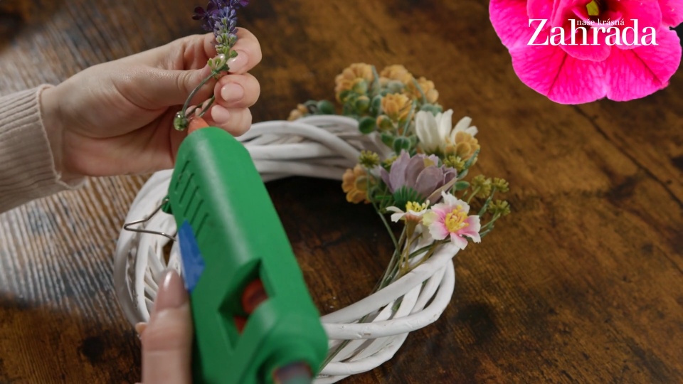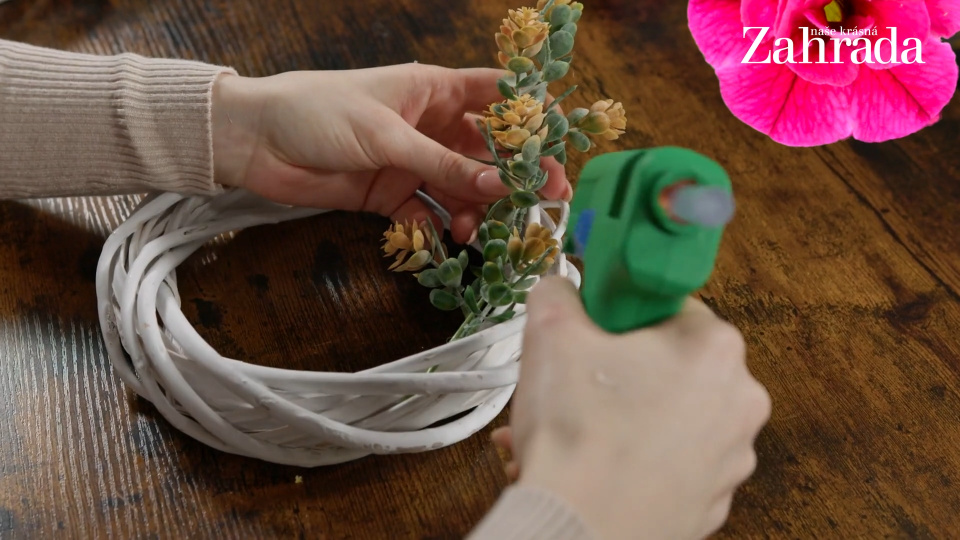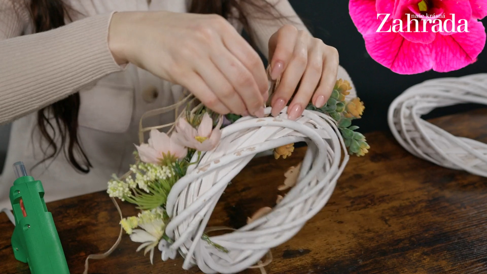 Květiny přilepujte vždy na několika místech, aby se přirozeně vinuly kolem proutěného věnečku