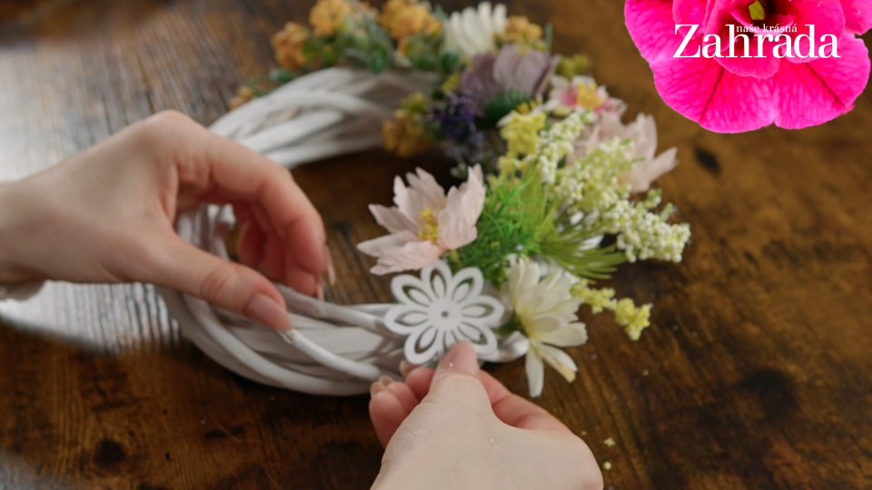 Květinami pokryjte 1/3 až 1/2 věnečku, zbytek věnce ponechte volný. Doplňte i dřevěnou dekorační kytičku
