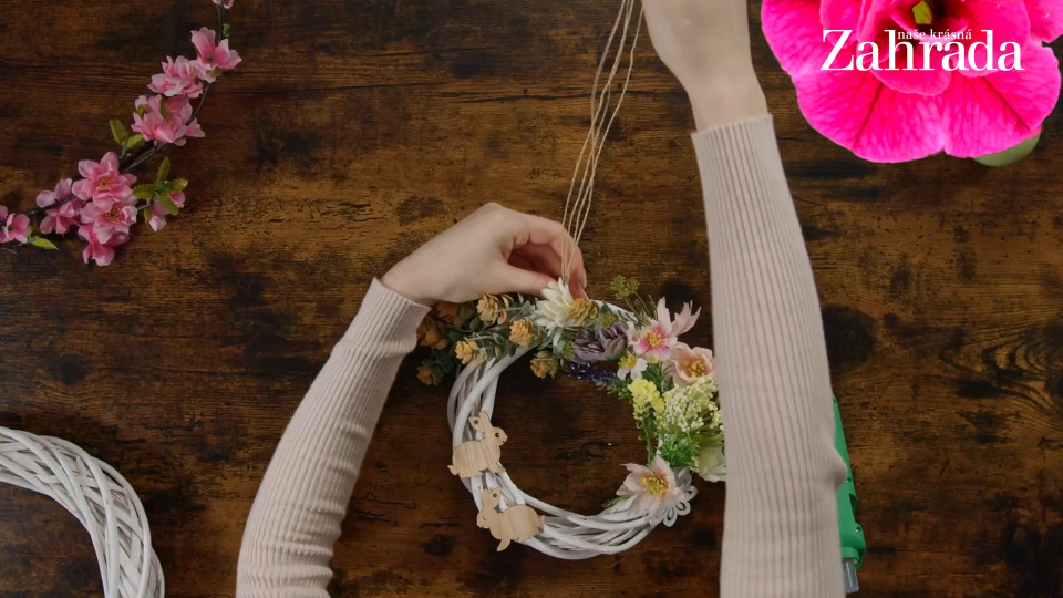 Na volnou stranu věnce nalepte dva malé dřevěné zajíčky, ale pěkně budou vypadat i kuřátka nebo vajíčka. Nakonec na věnec připevněte provázek