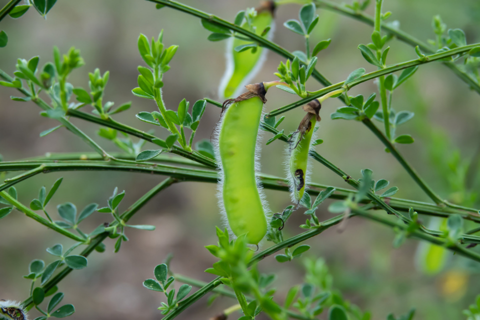V horních částech větví se během května až června objevují v paždí listů sytě žluté, 2-2,5 cm velké květy, které tvarem připomínají malé motýlky