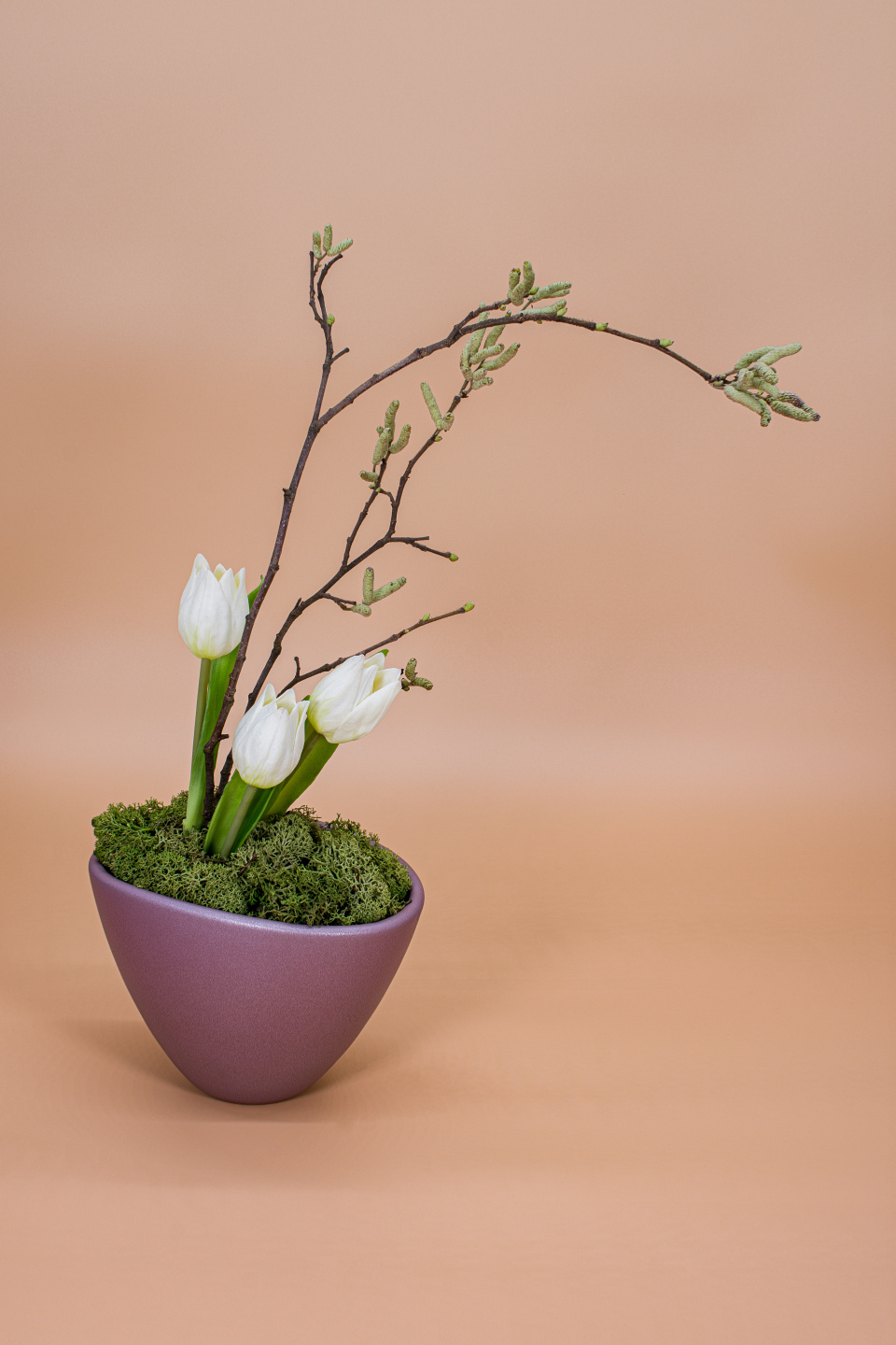 Principy ikebany můžeme použít i u jarních sesazovaných nádob. Dodáme jim tak dynamiku a harmonii zároveň.