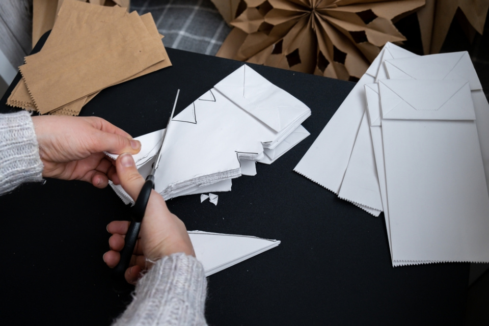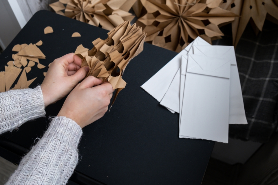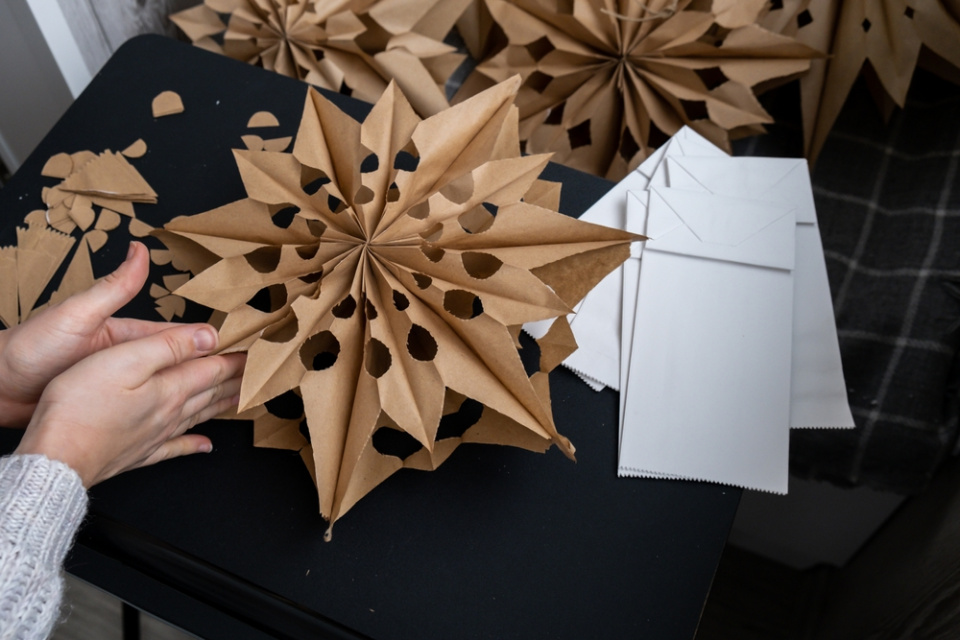 Krásně bude vypadat vánoční výzdoba, pokud použijete papírové sáčky v bílé i režné barvě, ale v papírnictví také najdete papírové sáčky v různých velikostech. Z menších můžete vyrobit papírové hvězdy jako ozdoby na vánoční stromek nebo i na adventní věnec, větší můžete rozvěsit různě po bytě