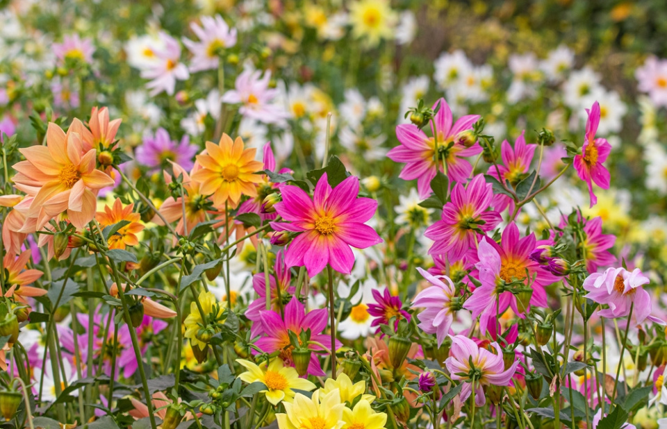 Jiřinky vykvétají v mnoha krásných barvách, od bílé přes žlutou, oranžovou, růžovou, červenou, vínovou až po šarlatovou barvu
