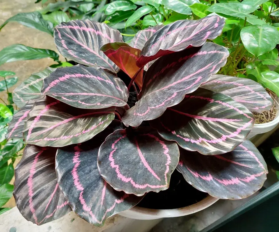 Calathea crimson, kalatea s méně výraznými tvary listů, ale s o to působivějšími barvami