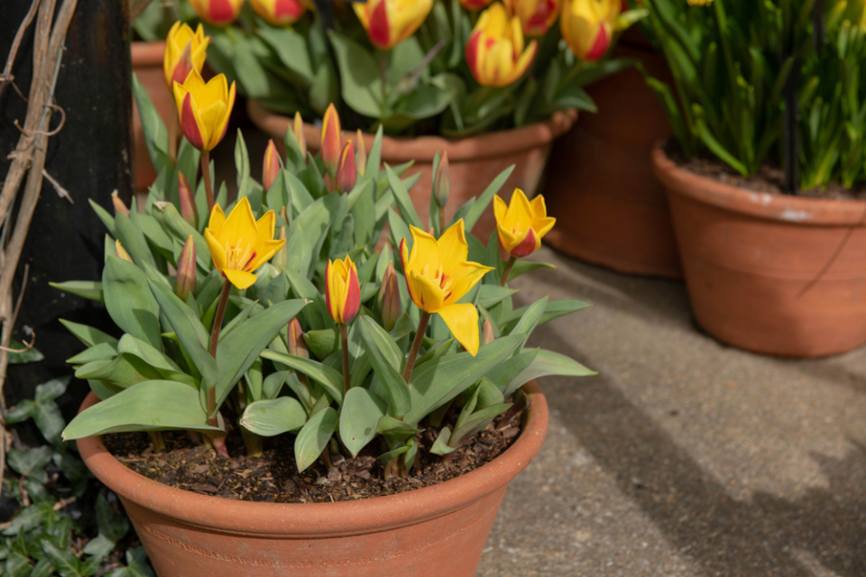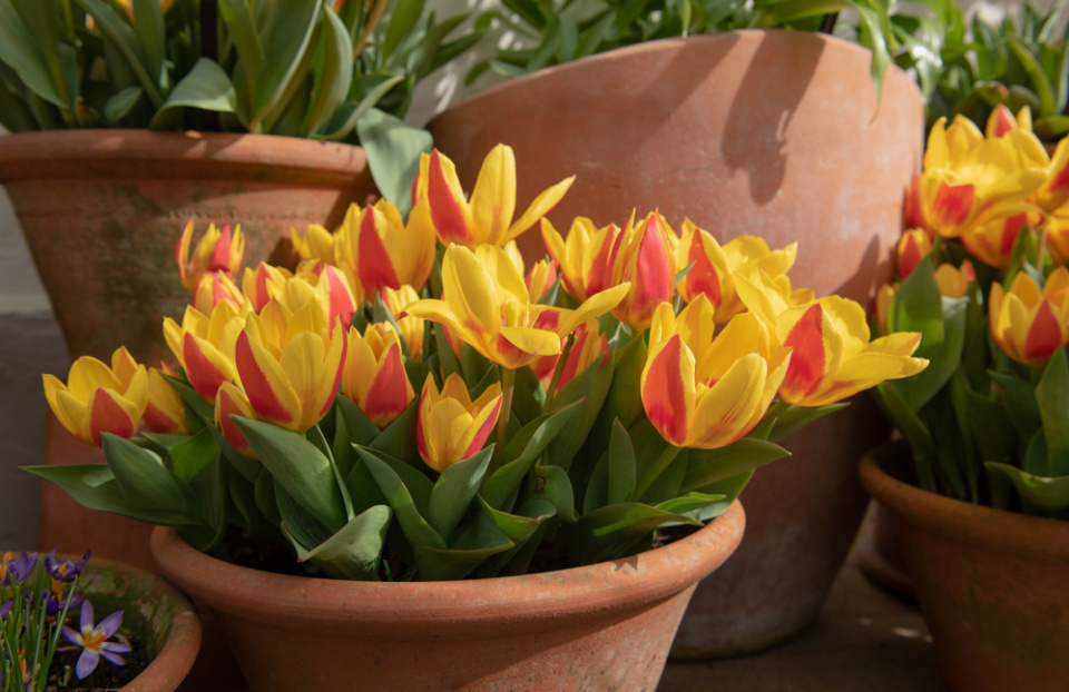 Tzv. násobení, tedy opakování stejných druhů cibulovin a nádob, ve kterých jsou vysazené, vypadá velmi působivě