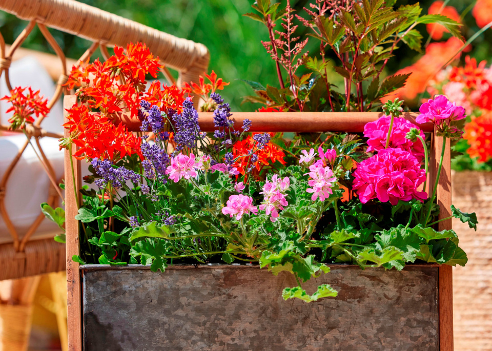 Muškáty můžete klidně pěstovat v jednom obalu společně s levandulí. I ona vyžaduje důkladné vyschnutí půdy před další zálivkou.