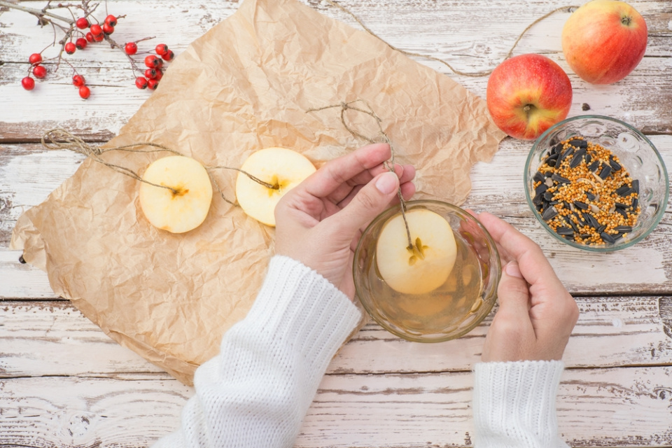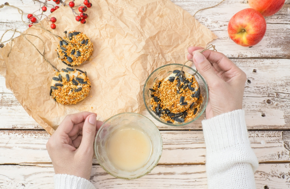 Plátky jablek a dýní namáčejte v rozpuštěném loji a obalujte semínky. Hotová krmítka nechte zavěšená v chladu, aby na nich lůj dobře zatuhnul