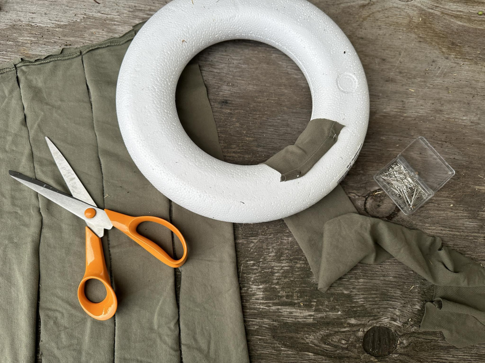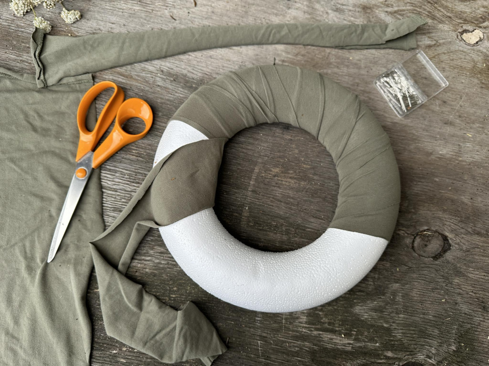 Tričkovinou omotejte celý věnec, nové pruhy i jejich konce vždy zajistěte zapíchnutím špendlíků