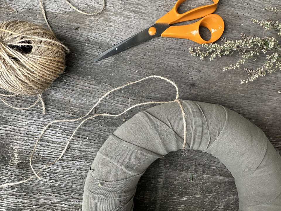 Na omotaný věnec uvažte provázek, ze kterého později vytvoříte očko na zavěšení věnce na stěnu