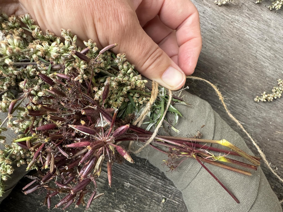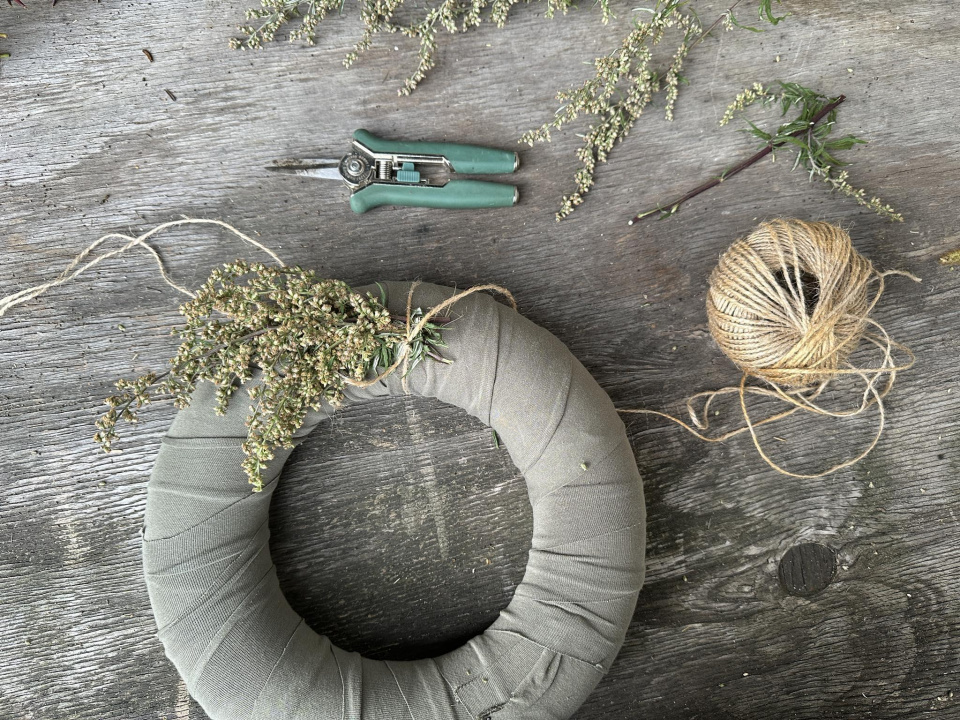 Rostlinný materiál si nastříhejte na asi 10 cm dlouhé kusy a provázkem začněte rostliny navazovat na věnec