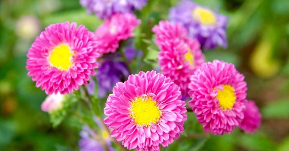 Astra čínská (Callistephus chinensis) – odrůdy s jednoduchými květy mají jasně rozlišený terč, který se u poloplných nebo plnokvětých kultivarů ztrácí. Podle jazykovitých květů se astry dělí na jehlicovité, chryzantémovité atd., podle výšky rostlin na nízké, střední a vysoké. Rostliny mají rády dostatek slunce a propustnou půdu a kvetou od léta do podzimu.