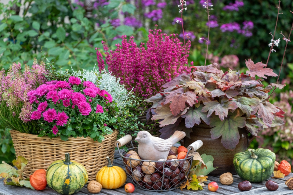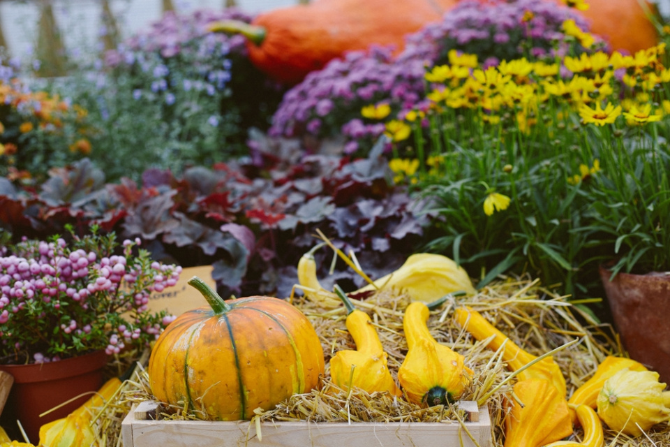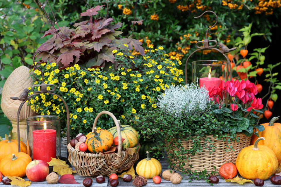 Mezi truhlíky a květináče s podzimními květinami postavte i drobné dekorace a svíčky
