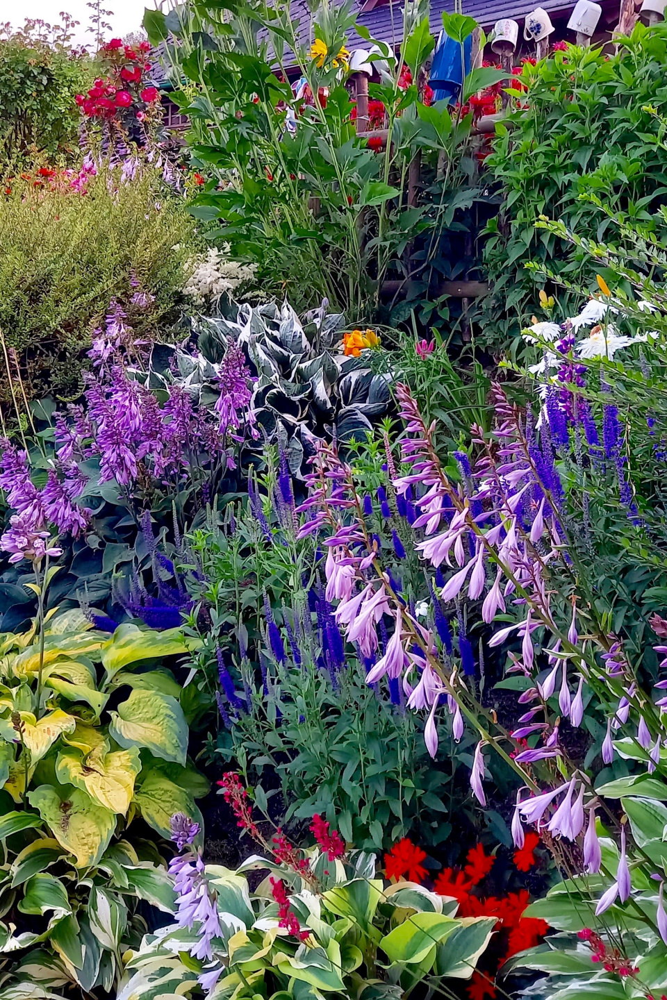 Ve svažitém záhonu pod plůtkem s hrníčky doplňují pestré listy a květy bohyšek modře kvetoucí rozrazily.