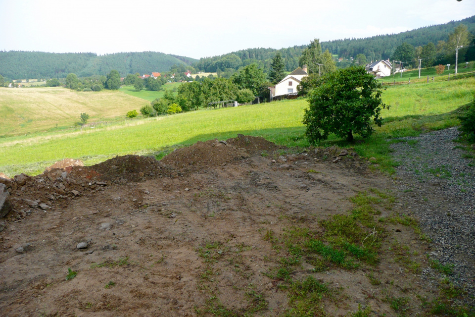Kromě rovinaté plochy u domu byla uměla vytvořena ještě rovina pro pergolu (na fotce vpravo).
