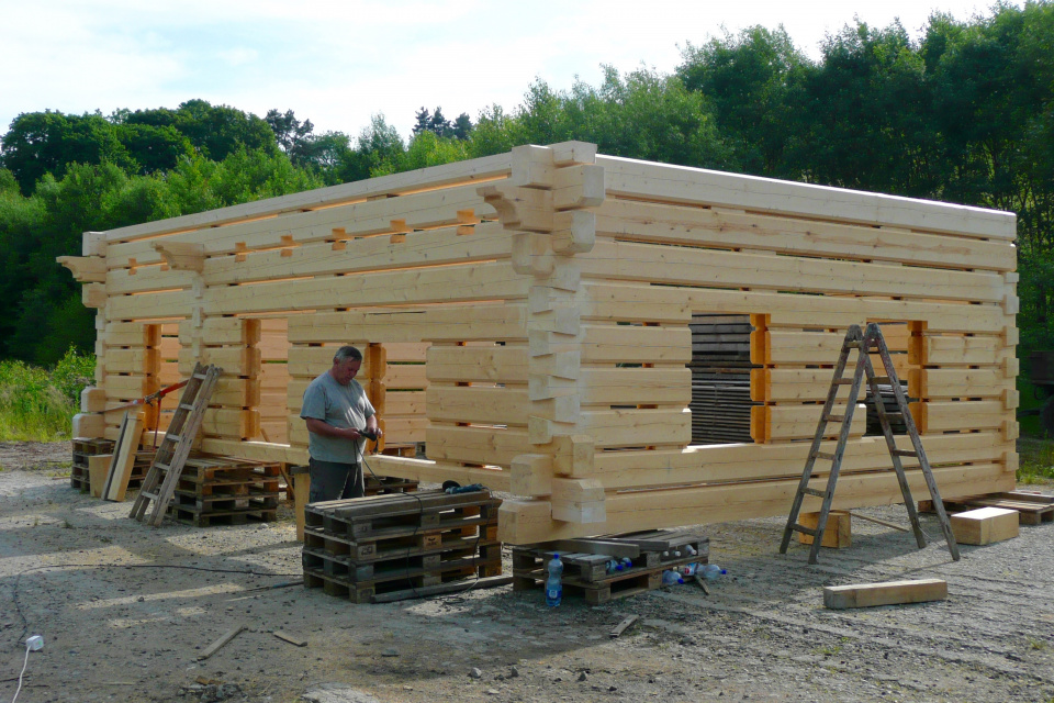 Nové roubení domu vyrobil Tinin muž. Nejprve ho na pile postavil nanečisto, a teprve pak začal skládat u domu.