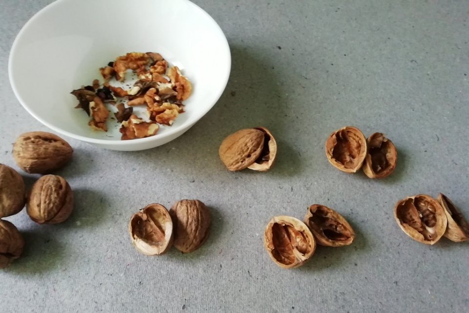 Nejprve si připravte skořápky vlašských ořechů. Každý ořech opatrně nožem rozlouskněte a dávejte pozor, aby obě poloviny skořápky zůstaly vcelku. Dvojice skořápek si vyrovnejte vždy vedle sebe, abyste je nepomíchali s dalšími skořápkami. Každý ořech má trochu jiný tvar, a tak by pomíchané skořápky k sobě špatně pasovaly