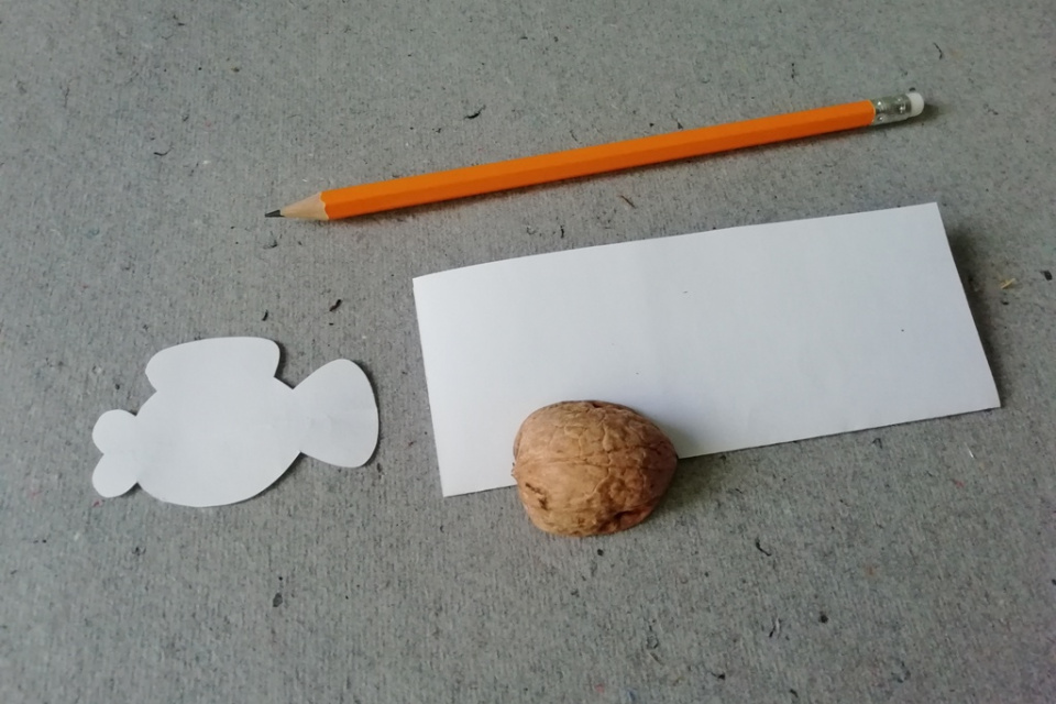 Obyčejný kancelářský papír přeložte na polovinu a obkreslete na něj půlku ořechové skořápky. Po rozložení dokreslete i druhou polovinu, včetně tlamičky, ocásku a ploutví. Přeložení na polovinu je důležité pro souměrné vytvoření ocásku a tlamičky