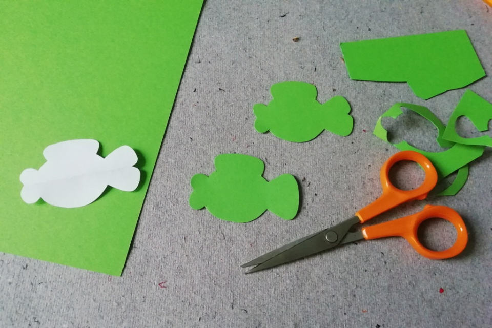 Podle připravené šablony si obkreslete a následně vystřihněte z tvrdé zelené čtvrtky kapříky. Samozřejmě můžete vybrat jakoukoliv jinou barvu, která se hodí k vašemu vánočnímu barevnému ladění dekorací