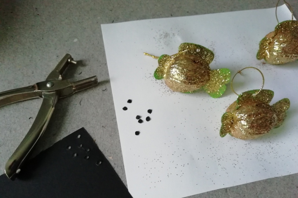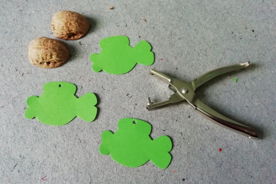 Děkovacími kleštičkami nebo obyčejnou kancelářskou děrovačkou vytvořte do ploutve kapříka dírku