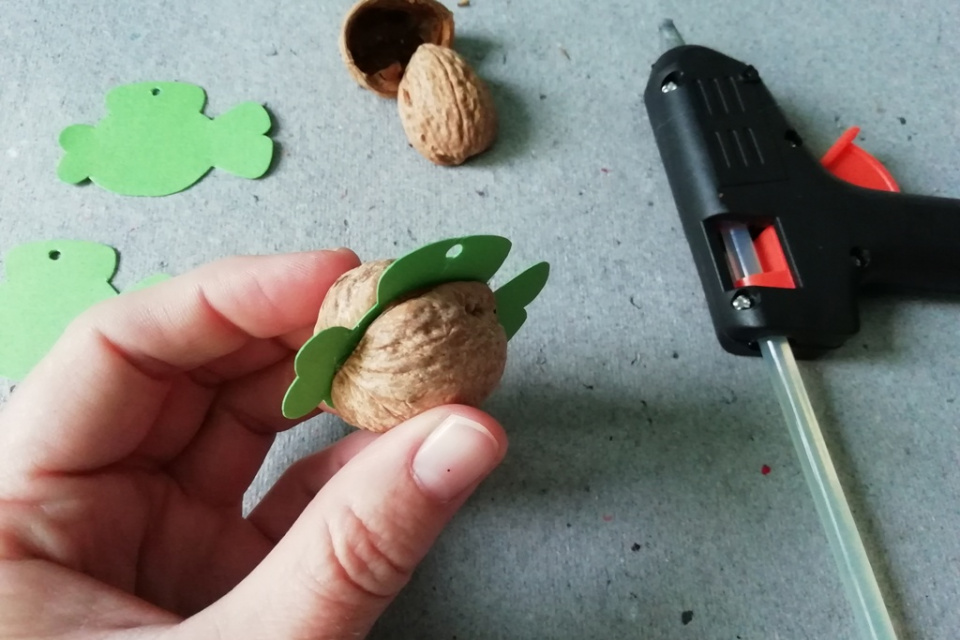 Tavnou pistolí nebo disperzním lepidlem slepte skořápky zpět k sobě a zároveň mezi ně vložte kapříka z papíru