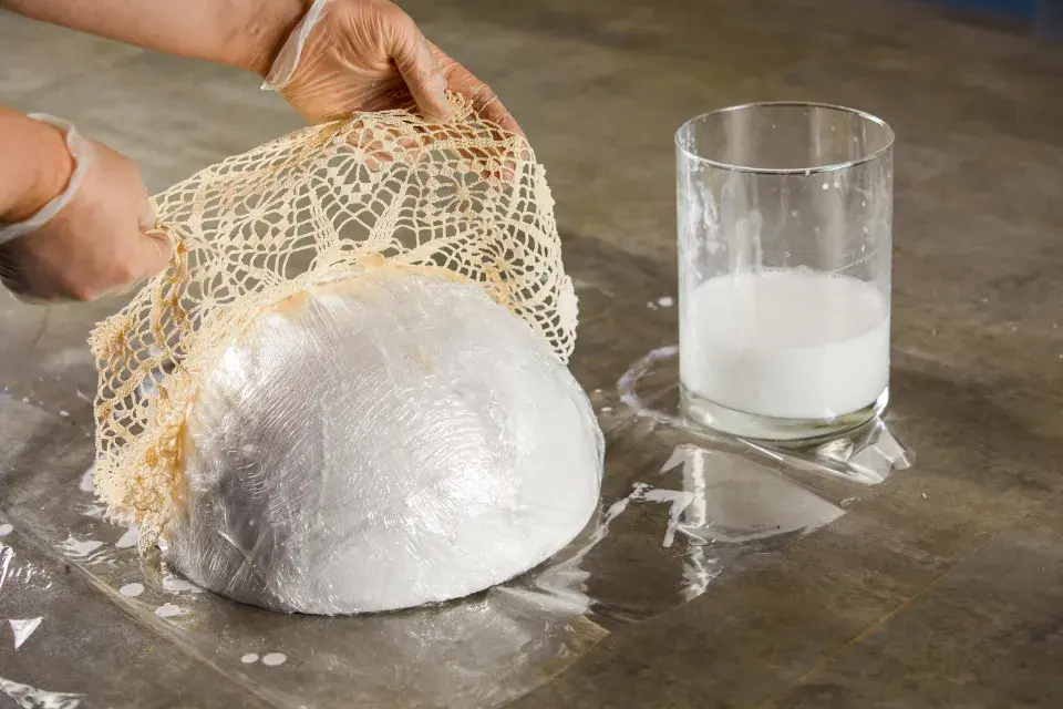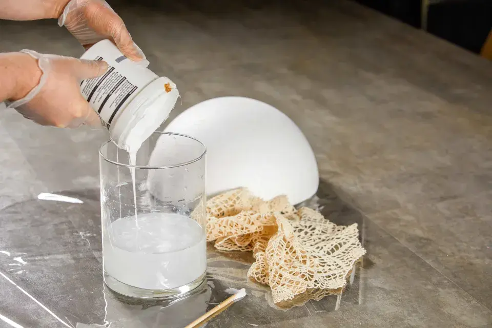 Ve sklenici zřeďte disperzní lepidlo s vodou v poměru 1:1. Polokouli z polystyrenu nebo plastovou misku celou obalte potravinovou fólií