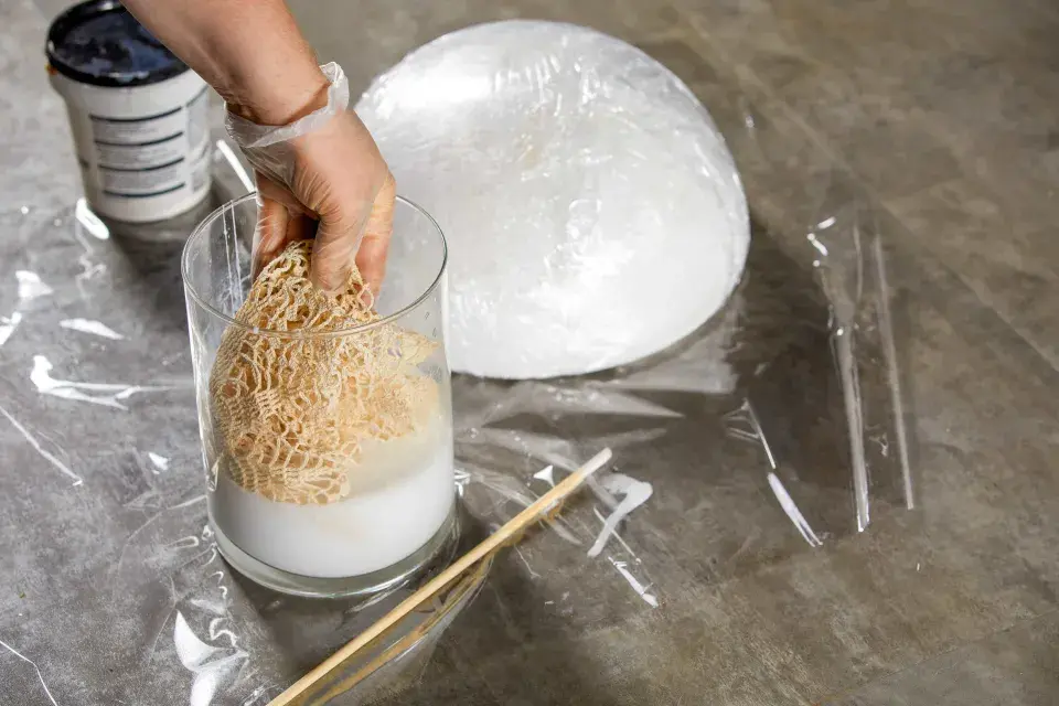 Háčkovanou dečku namočte do směsi lepidla a vody