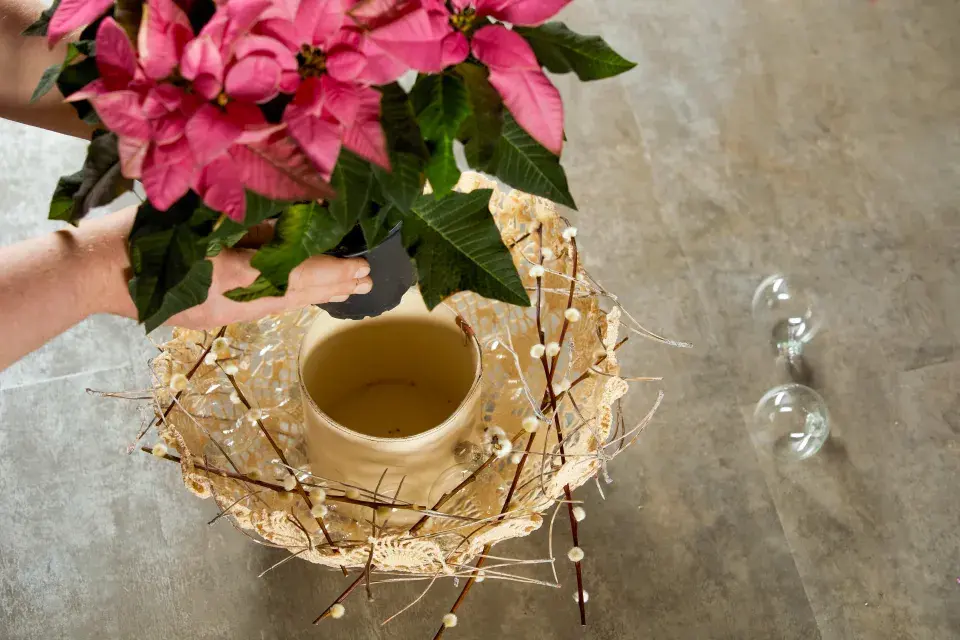 Po důkladném vyschnutí vzniklou krajkovou misku opatrně sundejte z formy. Krajková miska bude tvrdá a velmi pevná. Umístěte nepropustný obal na květináč doprostřed krajkové misky. Prostor mezi obalem na květináč a okrajem misky vyplňte průhlednými skleněnými baňkami nebo můžete použít i baňky barevné, podle vlastního vkusu a fantazie