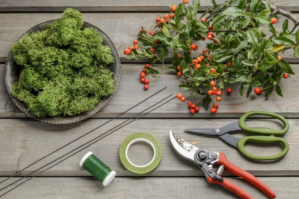 Co budete potřebovat: stabilizovaný mech, jeřabiny nebo plody hlohyně, kleště štípačky, zahradnické nůžky, vyvazovací drátek, vázací drátek, zelenou květinářskou pásku, tzv gutaperču