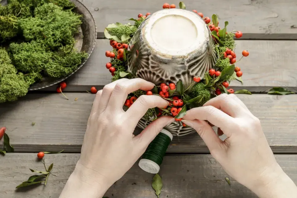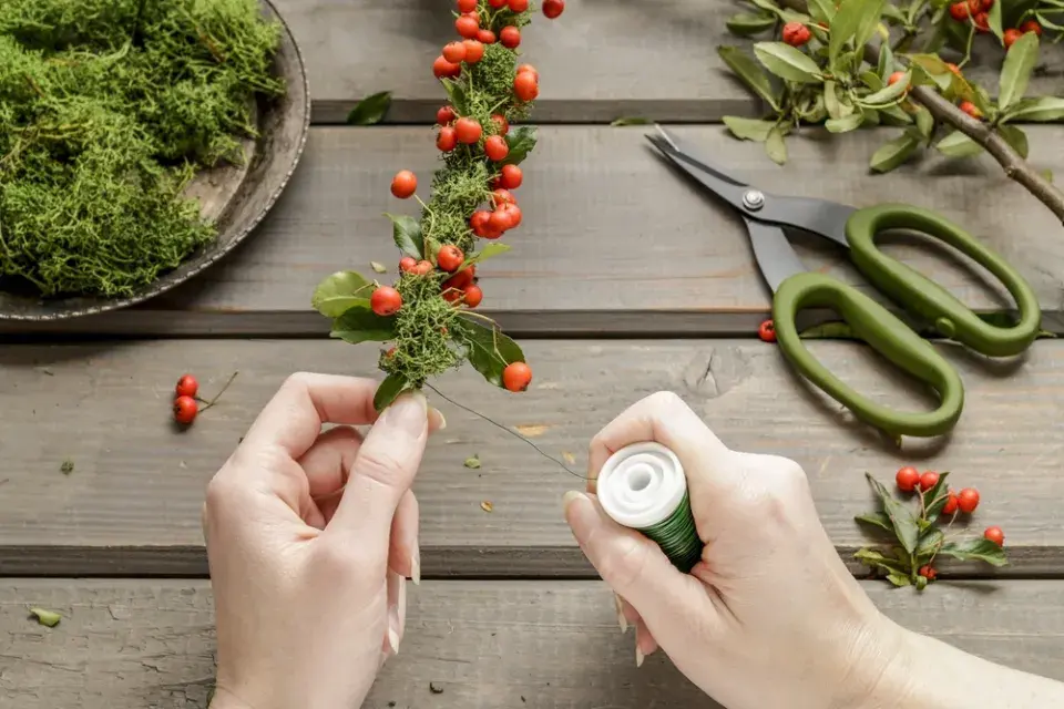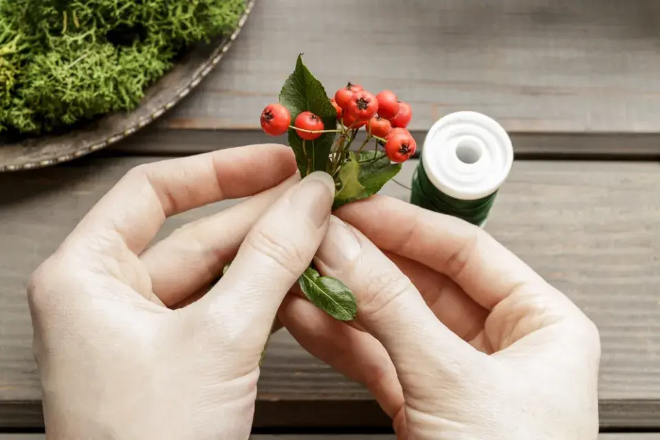 Začněte vázacím drátkem připevňovat malé pugétky červených plodů jeřabin nebo hlohyně a malé kousky stabilizovaného mechu