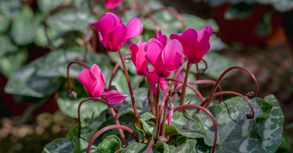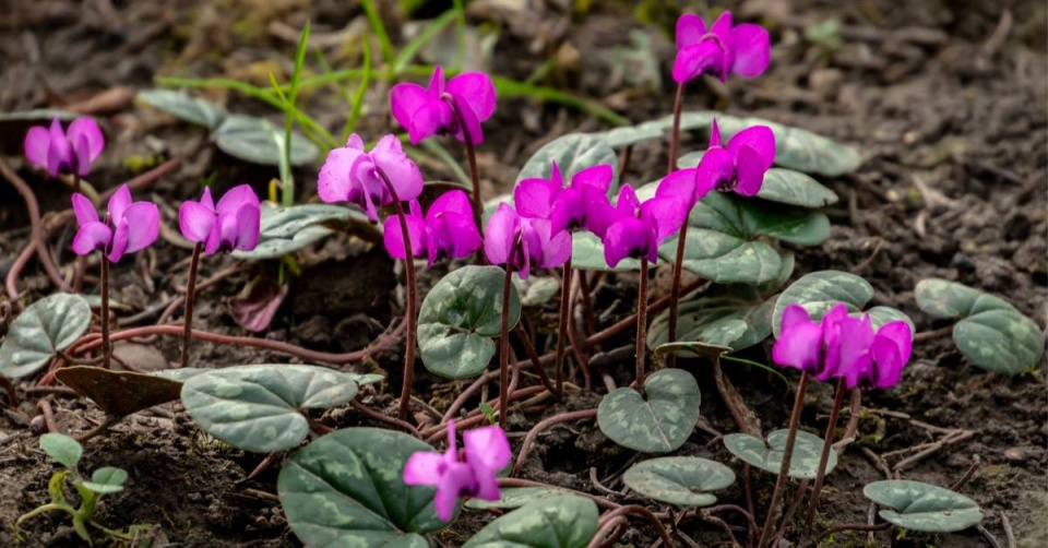 V souladu s českým jménem kvete brambořík jarní (Cyclamen coum – na fotce) už od února, zatímco brambořík břečťanolistý (Cyclamen hederifolium) otevírá poupata od konce srpna.