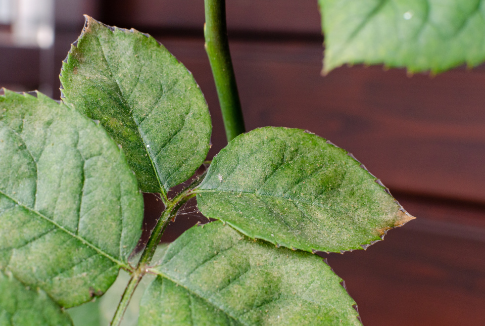 Přítomnost svilušek na růžích prozradí obvykle jejich jemné pavučinky.