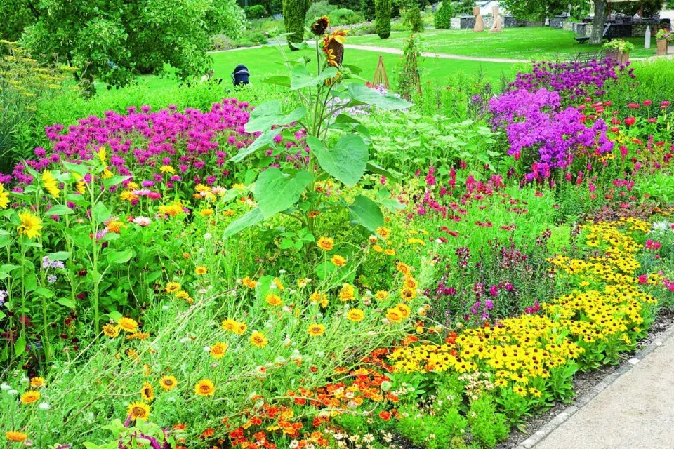 Centrální záhon plný letniček, v popředí je vidět oblíbená nerenka (Arctotis).