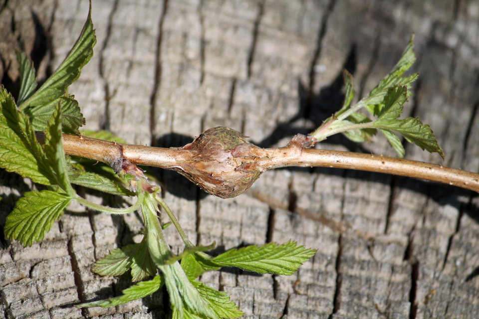 Bejlomorka ostružiníková vytváří na prutech maliníků a ostružiníků zduřeniny (hálky), v nichž žijí její larvy