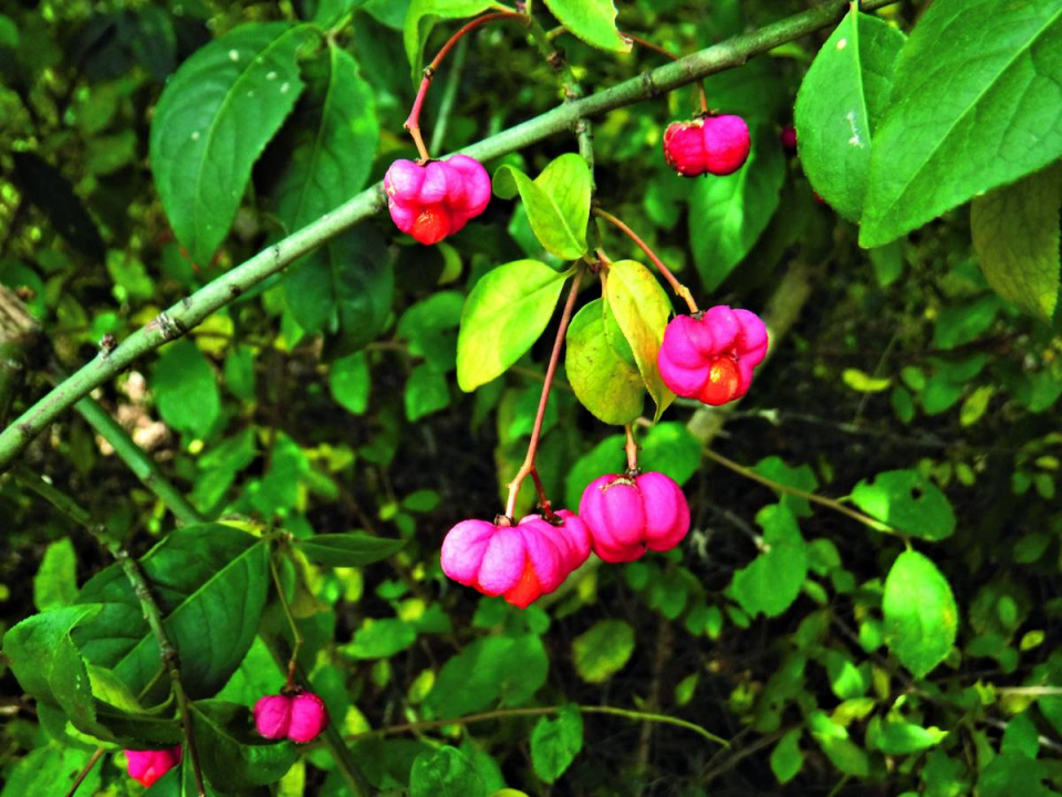 Atraktivní plody brslenu zkorkovatělého (Euonymus phellomanus) se podobají plodům brslenu evropského. Nezapomeňte, že jsou jedovaté.
