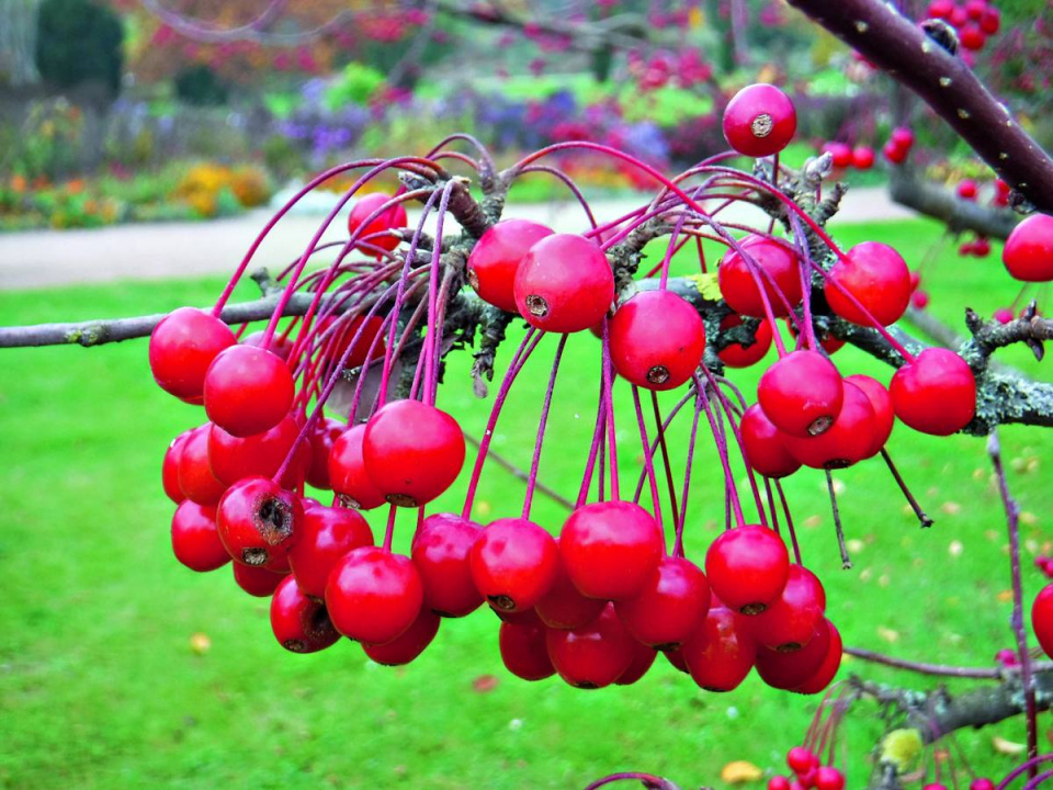 Druhů a odrůd okrasných jabloní (Malus) je mnoho; na podzim upoutají pozornost např. červené a žluté plody jabloně drobnoplodé.
