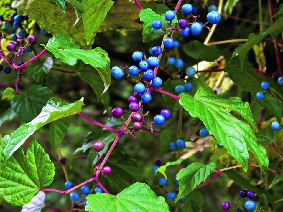 Mezi podzimními plody lze najít i modrou barvu. Liána révovníku žláznatého (Ampelopsis glandulosa) potřebuje oporu a chráněné místo.