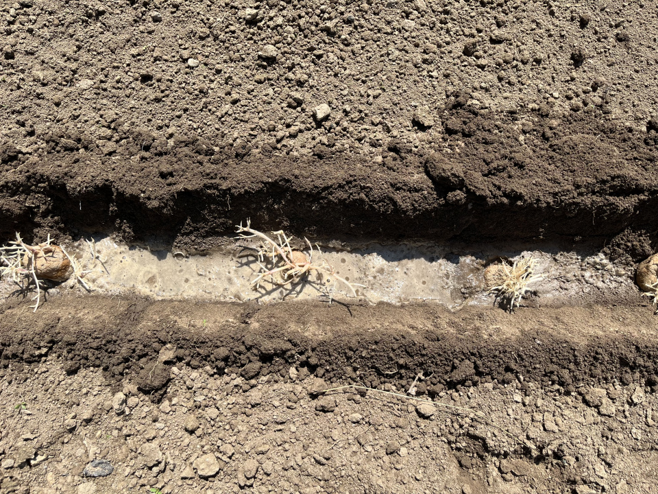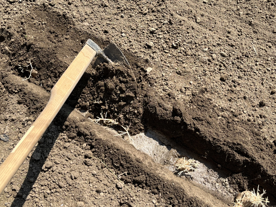 Motykou udělejte hlubší rýhy, které prolejete roztokem vody a kravského hnoje. Do výsadbových rýh zasaďte brambory cca 35 cm od sebe