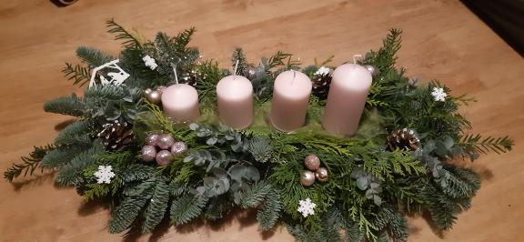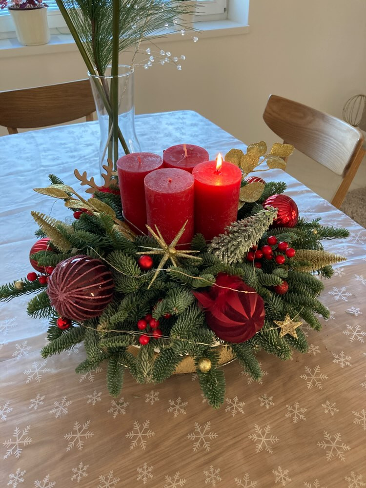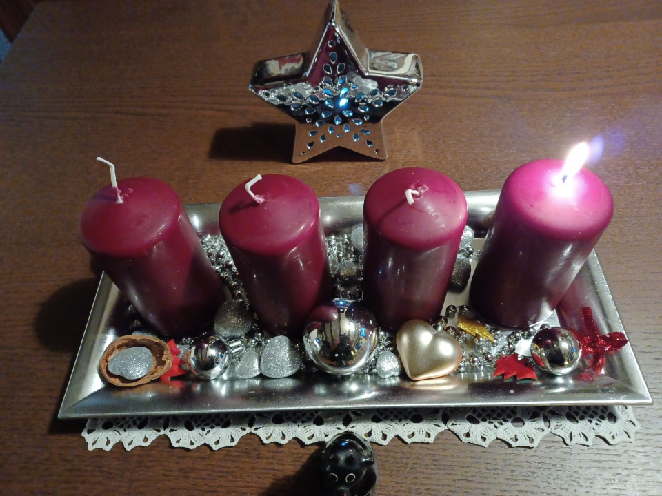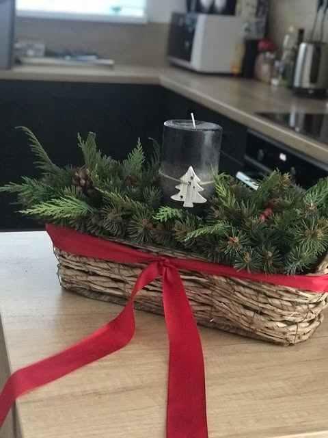 Paní Milena nám ke své fotografii připsala: "Už léta zdravím zdobím adventní svícen do dřevěného truhlíku a je to super. Na věnec nemám moc místa, a každý rok si nazdobím dle chuti a inspirace."